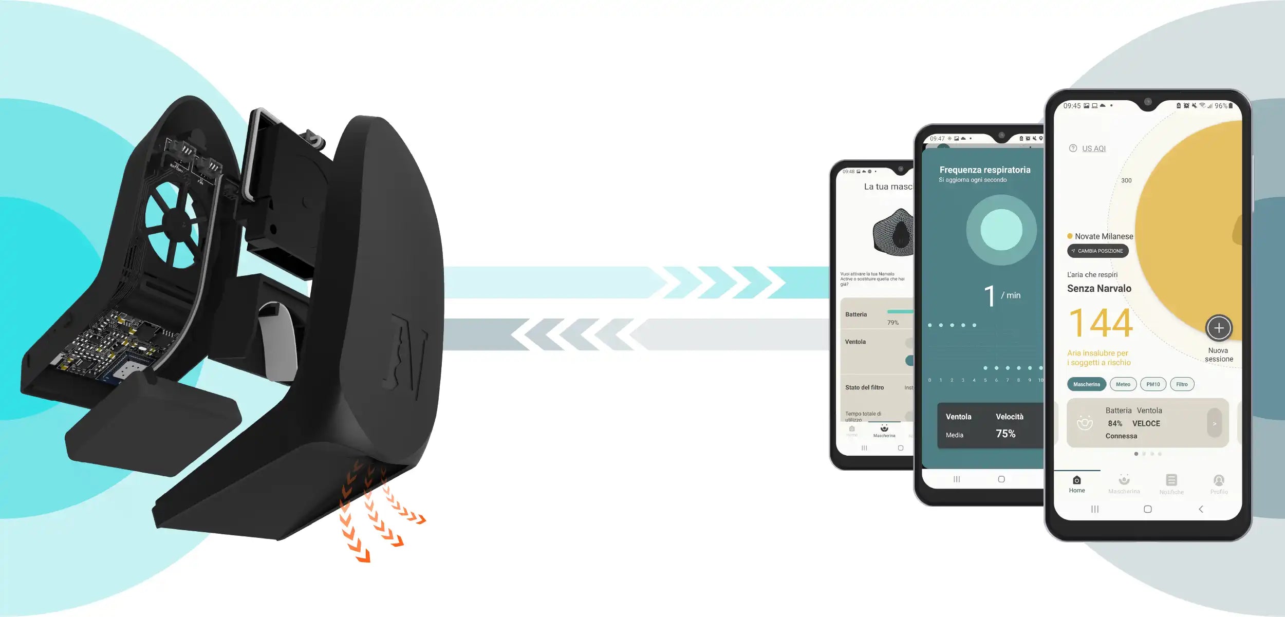 The Active Shield connects to the Narvalo App via Bluetooth. Thanks to sophisticated sensors, the device is able to detect your breathing rate and adapt the fan speed to your breathing