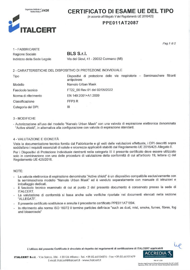 BLS512 in cobrand with Narvalo is a personal protective equipment (PPE) certified FFP2 according to the EN 149:2001+A1:2009 regulation.