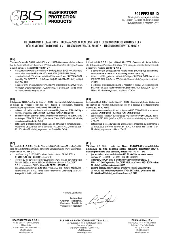 Di seguito, le certificazioni relative alle edizioni speciali delle mascherine FFP2 BLS 512, che confermano la massima protezione delle vie respiratorie.