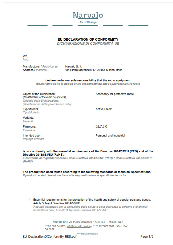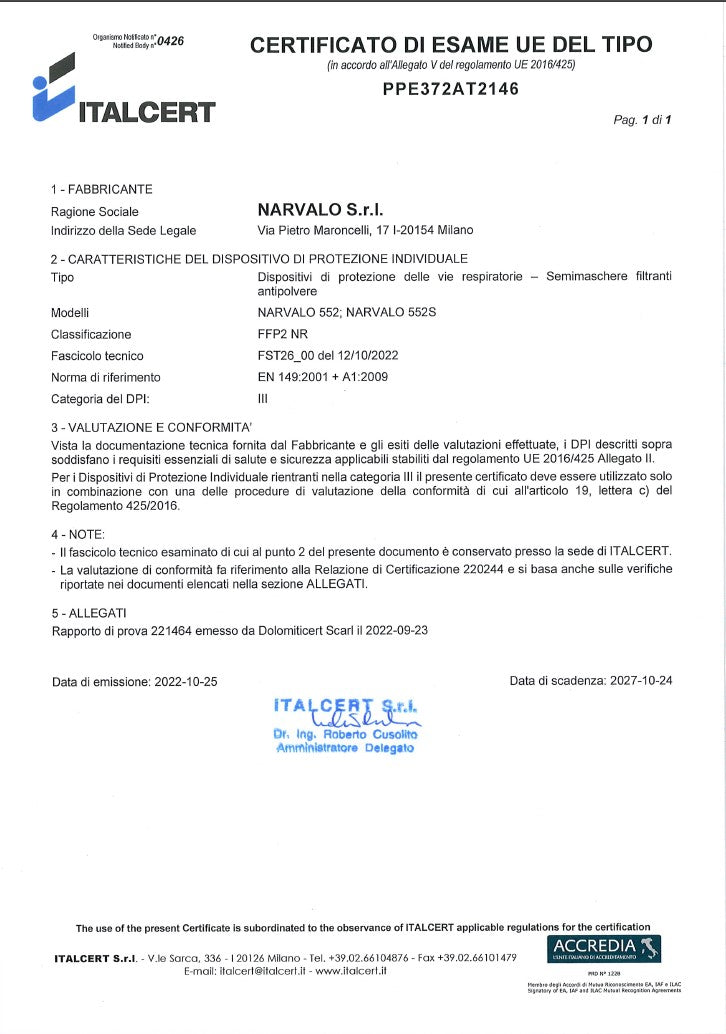 BLS 552 Narvalo Limited Edition è un dispositivo di protezione individuale (DPI) certificato FFP2 secondo la normativa EN 149:2001+A1:2009. Questa mascherina FFP2 Made in Italy è prodotta in collaborazione con BLS, azienda leader nel campo dei dispositivi per la protezione respiratoria.